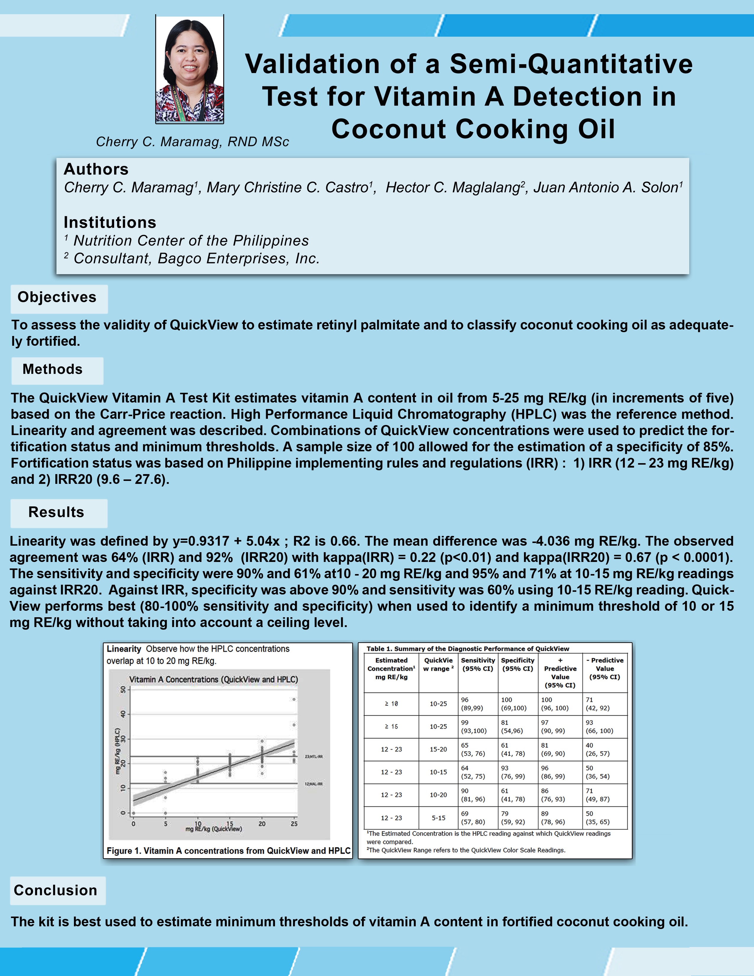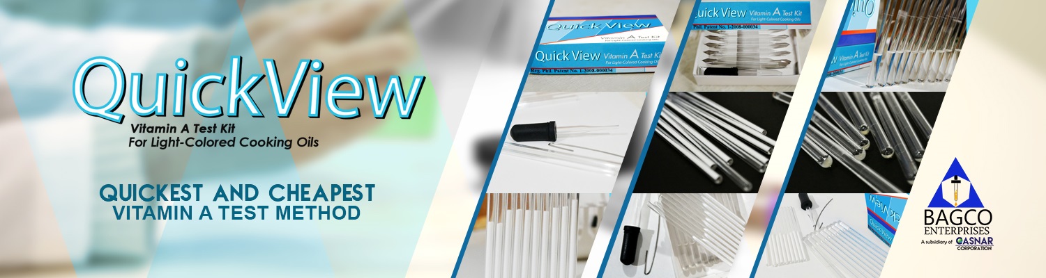 Monitoring vitamin A fortification of cooking oil, both for external and internal is expensive because of the high cost of analysis of vitamin A using the HPLC method. Based on this, the USAID – MOST project commissioned a research for the development of a field test kit to determine vitamin A level for fortified staples. The initial research was conducted by its Technical Specialist Dr. Aloysius Baes in 2004 based on the Carr-Price method (colorimetric method) for determining vitamin A in foods. In this method, the Carr-Price reagent produces a blue color in reaction with vitamin A. In the initial study, methods were developed to delay the loss of blue color using an absorbent. However, the methods developed were appropriate only for qualitative measurement. Following the demise of Dr. Baes, the lead chemist of an oil company saw opportunities to improve and eventually commercialize the test kit as a semi-quantitative test kit to test vitamin A in cooking oil. Thus the Bagco Enterprises QuickView Vitamin A Test Kit for light colored cooking oils was developed and patented. With assistance from the USAID-MOST Project, the QuickView Vitamin A Test Kit has been calibrated against HPLC method by the Food and Drug Administration (FDA) and by Nutrition Center of the Philippines (See Validation Test of QuickView Kit).The test kit has also been used in monitoring by FDA, Philippine Coconut Authority (PCA), Food and Nutrition Research Institute (FNRI), local cooking oil manufacturers and by the Ethiopia Oil Fortification Program.Validation Test of QuickView Kit